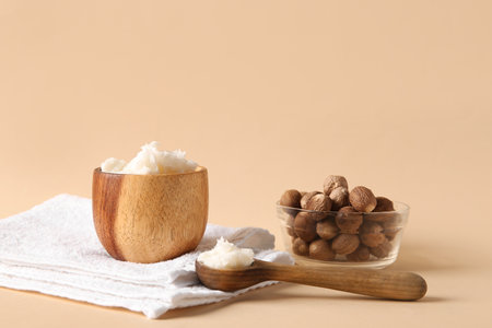 Bowl and spoon of shea butter with nuts on beige background