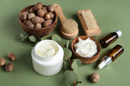 Massage body brushes, nuts, jar and bowl with shea butter on green background, closeup