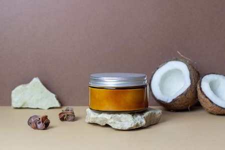 Coconut cream or oil in a glass jar and fresh coconut. Natural cosmetics