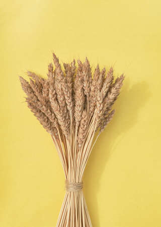 Bunch of spikelets of wheat tied with jute twine, isolated on yellow background. Flat lay.