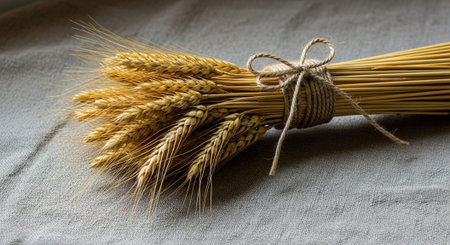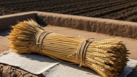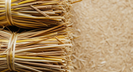 Close up of two tightly tied bundles of dry straw on a textured background. Clear details and vibrant colors e...