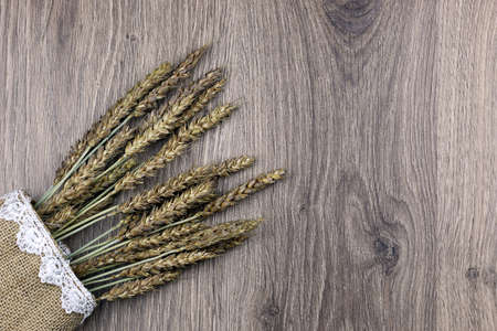 wooden background with a bouquet of ripe wheat ears