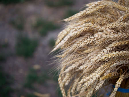 bouquet of harvested ears of wheat wrapped in cloth on a wheat field during the harvest. Background of ripening ears of wheat field and sunlight. Selective focus.