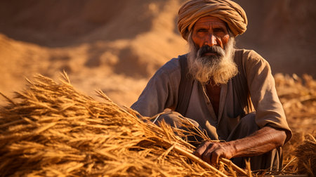a man with a beard and turban holding a bundle of wheat