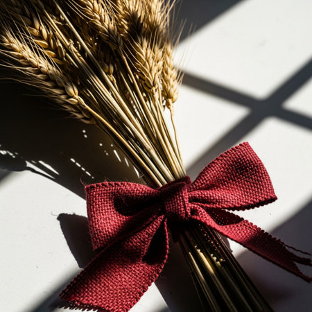 A golden harvest celebration showcasing a beautiful bouquet of wheat against a vibrant red backdrop during the autumn festival