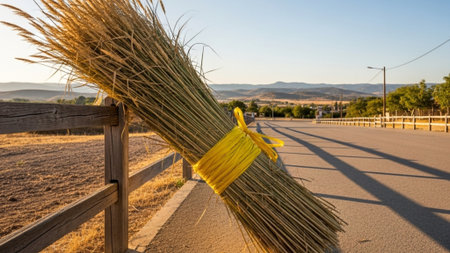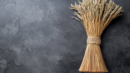This image features a natural dried grass broom bound with twine, set against a dark textured background. Perfect for rustic home decor or agricultural themes.