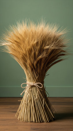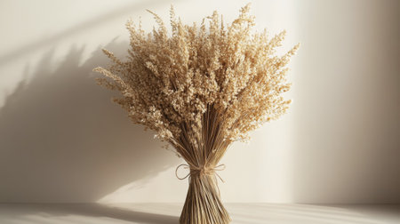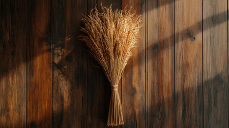 A beautiful bunch of dried grass is elegantly displayed against a rustic wooden background, accentuated by soft shadows and natural light, creating a serene atmosphere.