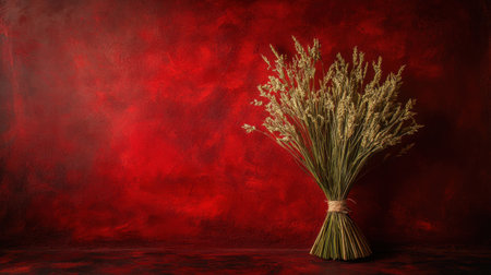 This captivating image features a dried wheat bouquet elegantly arranged against a striking red textured background, creating a striking visual appeal.
