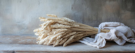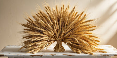 AI Generated. Wheat bouquet displayed on a wooden table creating a rustic harvest themed copy space image