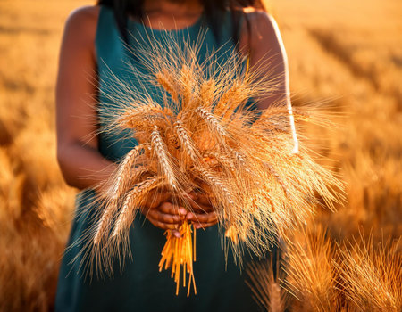 A woman gathers wheat in a field surrounded by golden hues of sunset showcasing hard work and connection to nature.
