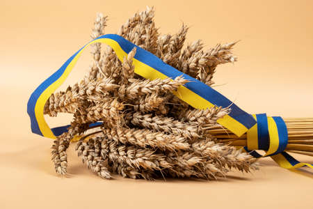 delivery of Ukrainian grain for the hungry, wheat with a yellow-blue ribbon symbol of Ukraine