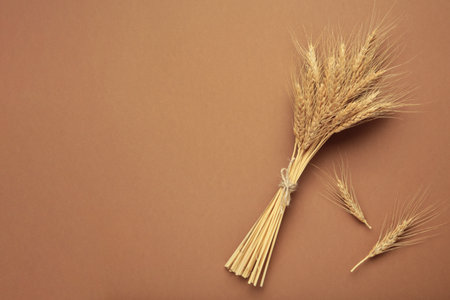 Ears of wheat on brown background. Space for text. Top view