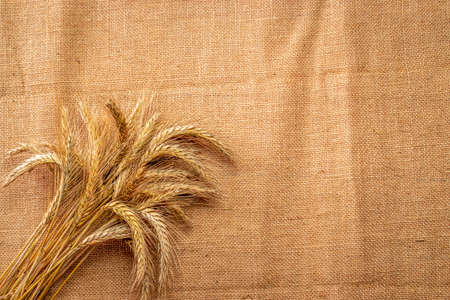 A bunch of golden ears of rye on a fabric of coarse linen threads. Spiny ears close up.