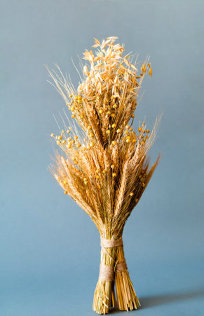 Didukh or sheaf of rye and dry cereals on a gray background. The concept of the oldest cults of Ukrainian Christmas rites. Close-up