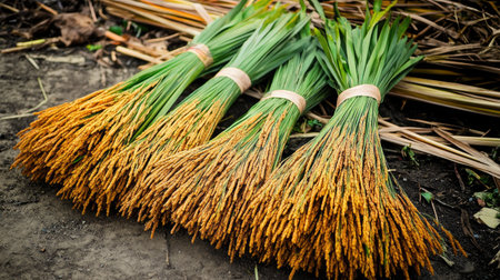 Close-up of freshly harvested paddy rice bundles lying on the ground, showcasing the golden grains and lush green leaves, symbolizing the bounty of a successful harvest.