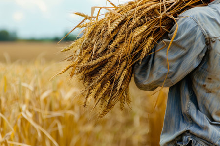 A worker is captured from the back carrying a large sheaf of golden wheat over their shoulder in a sunlit field, symbolizing harvest and agriculture
