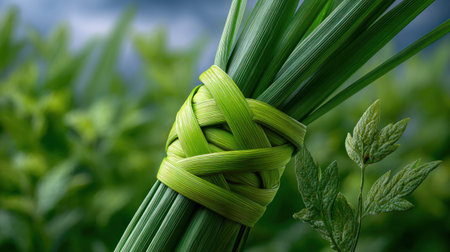 Close up of vibrant green leaves intricately woven, symbolizing unity and nature's beauty against a lush, blurred background