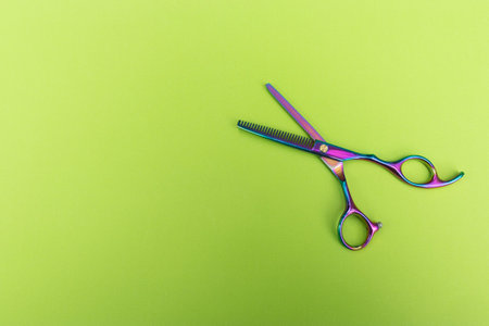 Banner flat lay from above of professional silver hair cutting shears set on green background. Hairdresser salon equipment and haircut work tools concept during quarantine with copy space.