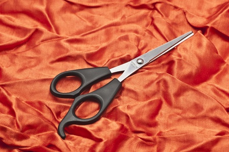 Sharp scissors with black and red arms in a male hand. Small stationery scissors in the left hand. Middle-aged man of European race. Stationery