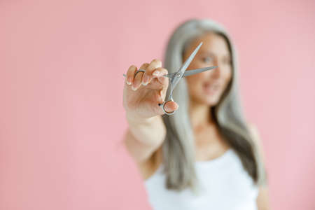 Happy middle aged Asian woman poses on pink background, focus on hand with scissors
