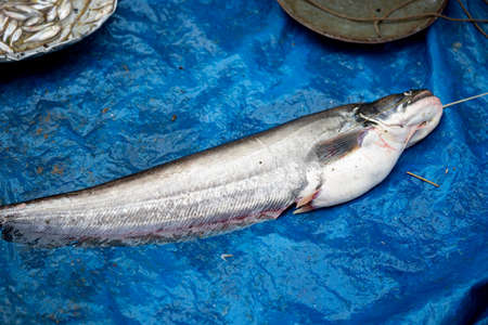 Wild catfish on the blue background. Fish concept with copy space ideal for restaurants. Levitate catfish with long mustache.