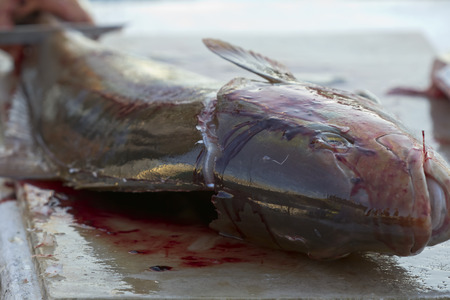 Fishermen cleaning and filleting a fresh caught saltwater fish.