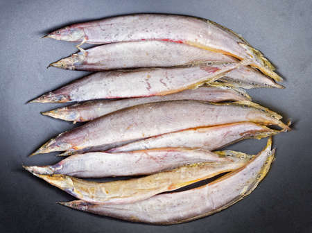 Dried salted Spotfinned spinyeel - Macrognathus siamensis. on dish