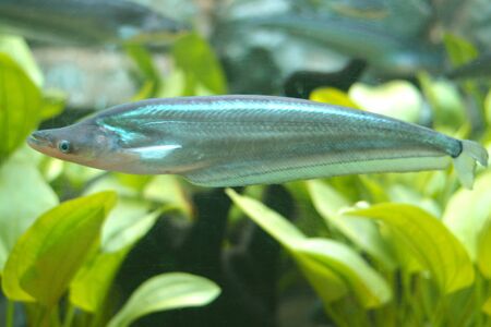 A unique fish glides gracefully among lush green plants in clear water. Sunlight filters through creating a serene aquatic scene.