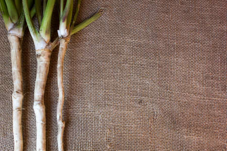 fresh, peeled, raw horseradish root, on sacking