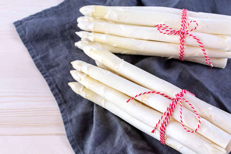 New harvest of white asparagus, two bunches high quality raw asparagus in spring season, ready to cook close up