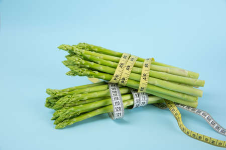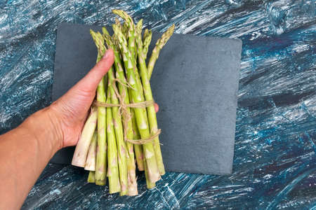 Delicious bunch of raw ripe green asparagus new harvest isolated on trendy blue background flat lay food concept
