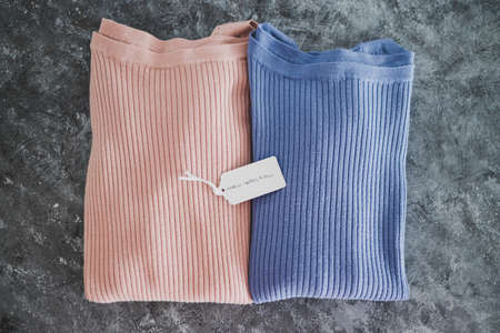 shopping and marketing concept, knit jumpers in alternative colours with New Collection text on price tag