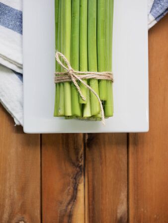 Close up view of bunch of fresh asparagus tied rope.