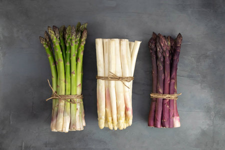 Three bunches of different fresh asparagus isolated on grey. Purple white and green asparagus.