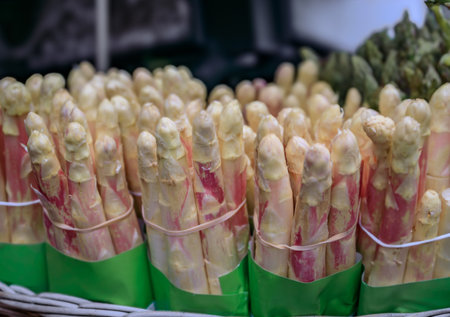 Bundles of large fresh white asparagus spears with a pink hue are for sale at an outdoor market stall in the spring in Zurich, Switzerland