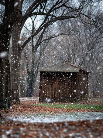Winter Wooden Cabin Snow Falling Peaceful Nature Scene Tranquil Snowy Landscape Cold Season Rustic