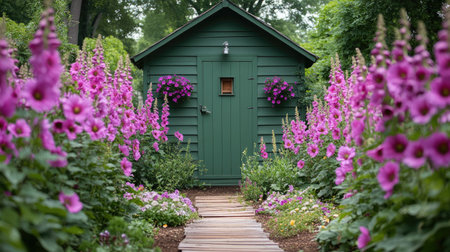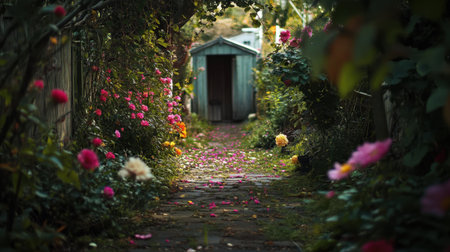 Tranquil garden pathway adorned with vibrant blooms leads to a charming rustic shed, surrounded by lush greenery, creating a peaceful outdoor retreat.