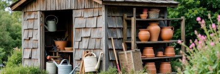 A picturesque garden shed showcasing various gardening tools and vibrant flower pots, perfect for gardening enthusiasts and serene outdoor settings.
