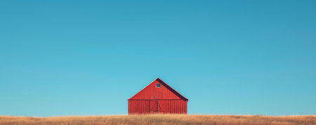 Red barn on a grassy hill with clear blue sky, minimalistic rural scene