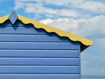 Blue and yellow wooden beach hut against blue cloudy sky with copyspace