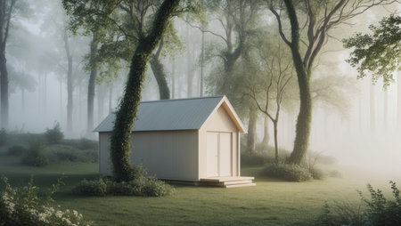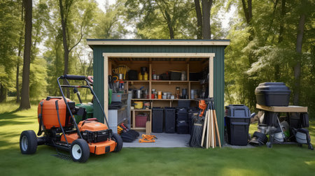 A charming rustic wooden shed nestled in a lush green landscape, surrounded by vibrant foliage and gardening tools, creating a serene outdoor atmosphere.