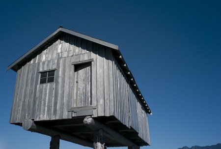 Small wooden house on a foggy day in Iceland, Europe.