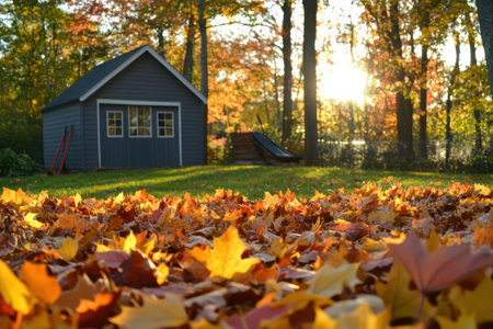 Crunchy autumn leaves piled with rakes nearby, sunny garden shed in background symbolizing fall yard work and seasonal cleanup.