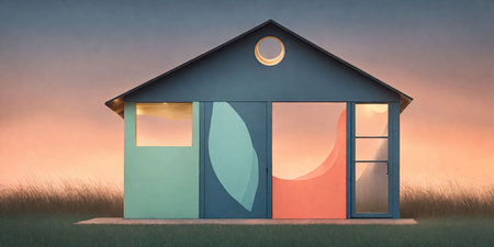 Conceptual image of a house with windows and door at sunset