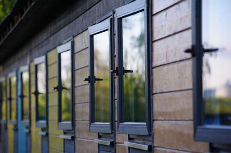 Beach huts coloured doors on wooden sea side huts.sun sea and Sandy beach living by the ocean
