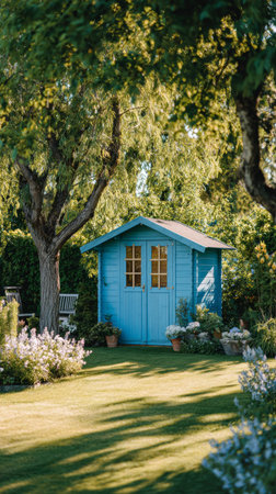 Charming blue garden shed surrounded by lush green trees, blooming flowers, and potted plants in sunlit backyard