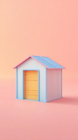 A minimalist illustration of a shed with a yellow door and blue roof, set against a pastel peach background.