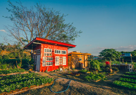 View of farm with red wooden house and a bathroom in the middle on a sunny day. There are many organic and chemical-free vegetable plots. There are many trees in the background with copy space on top.