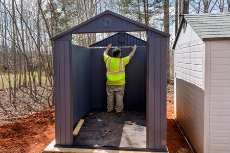 Worker assembles plastic vinyl storage shed in backyard of house nearby
