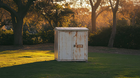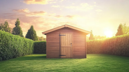 Outdoor garden storage with neat design sitting on green turf under dramatic golden sunset